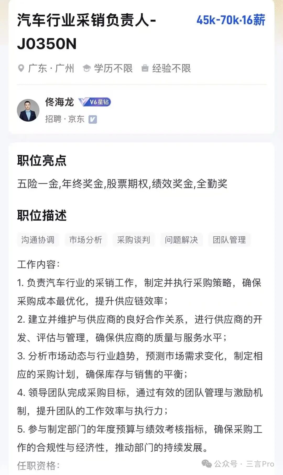The annual salary of the person in charge of procurement and sales in the automotive industry exceeds 1.1 million yuan (45k-70k * 16 salary), requiring 5-10 years of relevant experience, familiarity with the automotive parts procurement process and supply chain management.