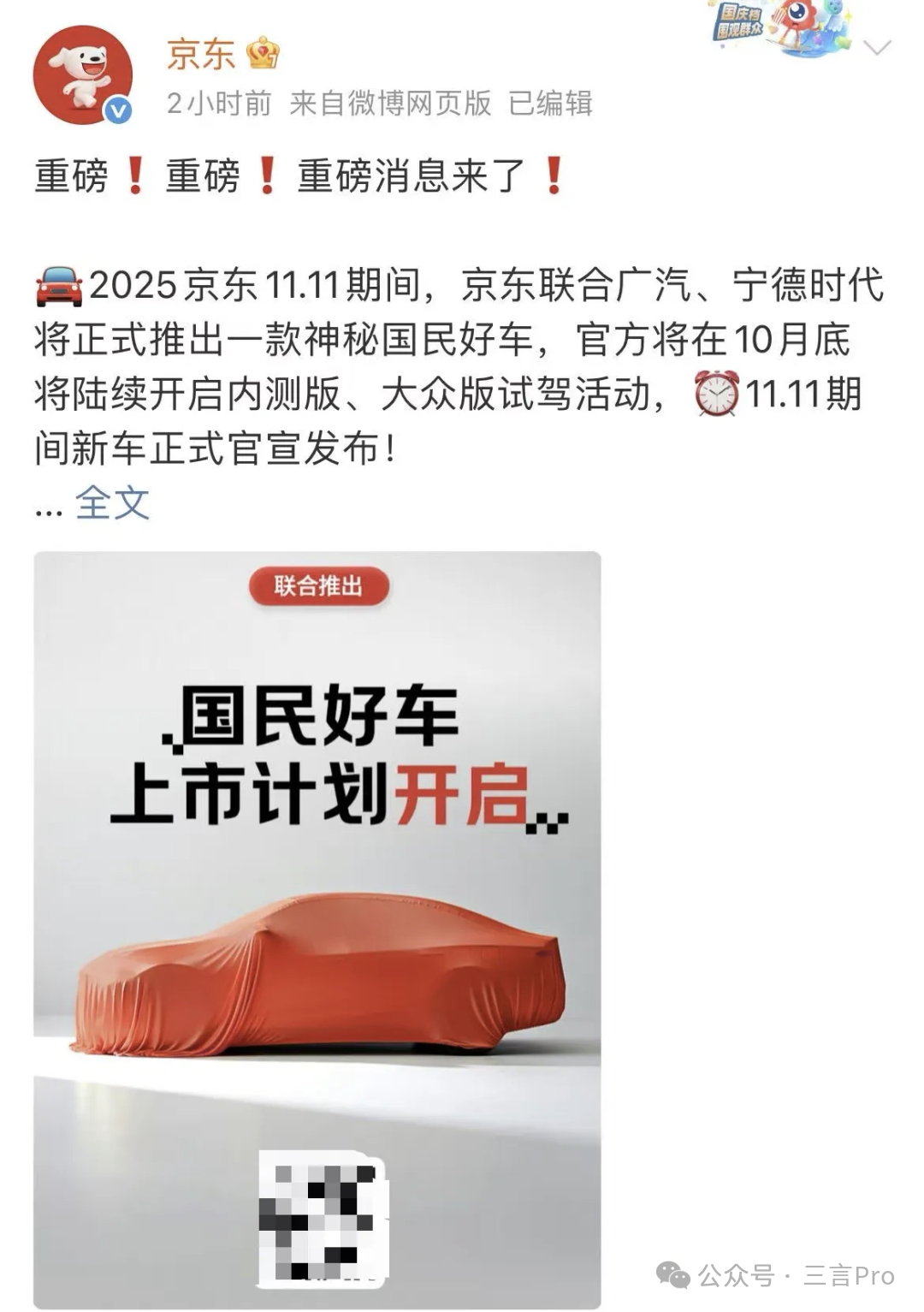 On October 14th, JD.com announced at the 2025 JD 11.11 Global Goods Festival that it will jointly launch a new energy vehicle with CATL's Time Electric Service and GAC Group.